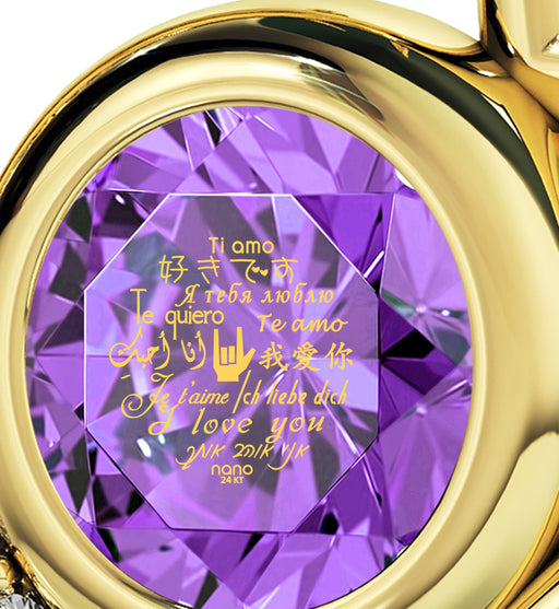 Bargain StoreIn stockA sparkling round cubic zirconia gemstone pendant intricately inscribed with "I love you" in 120 different languages in 24k gold, set in a gold pla...